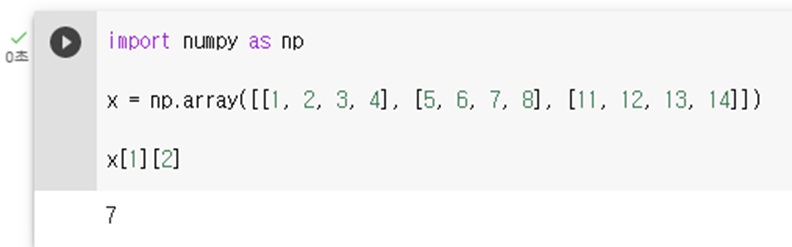 주어진 numpy array에서 7을 출력하게 하려면 어떻게 indexing을 해야하는가? python 명령어를 쓰세요.