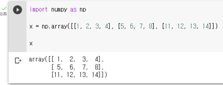 다음과 같은 데이터가 들어있는 numpy ndarray를 만들려면 어떤 명령어를 입력해야하는가?