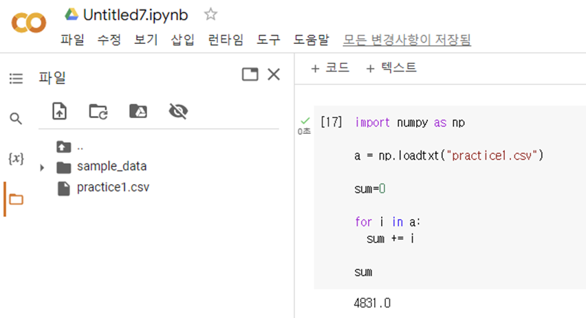 google colab을 이용하여 첨부된 practice1.csv화일을 google drive에 올리고, 해당 화일을 읽어들여 모든 숫자를 더하여 출력하는 프로그램을 작성하세요. (numpy.loadtxt를 사용해서 csv를 읽어올 것.)