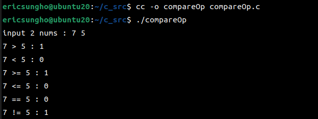 printf("%d >= %d : %d\n", a, b, a >= b);