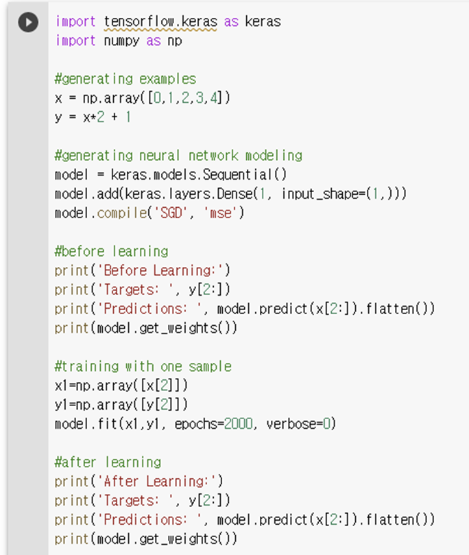 해당 프로그램은 y=2x+1을 학습하기 위해 입력데이터로 2개의 데이터 (x[:2]) 를 사용하였다. 한개의 데이터로도 학습이 가능할까? 예를 들어 x[2]와 y[2]만을 가지고 학습하면 어떻게 될까?