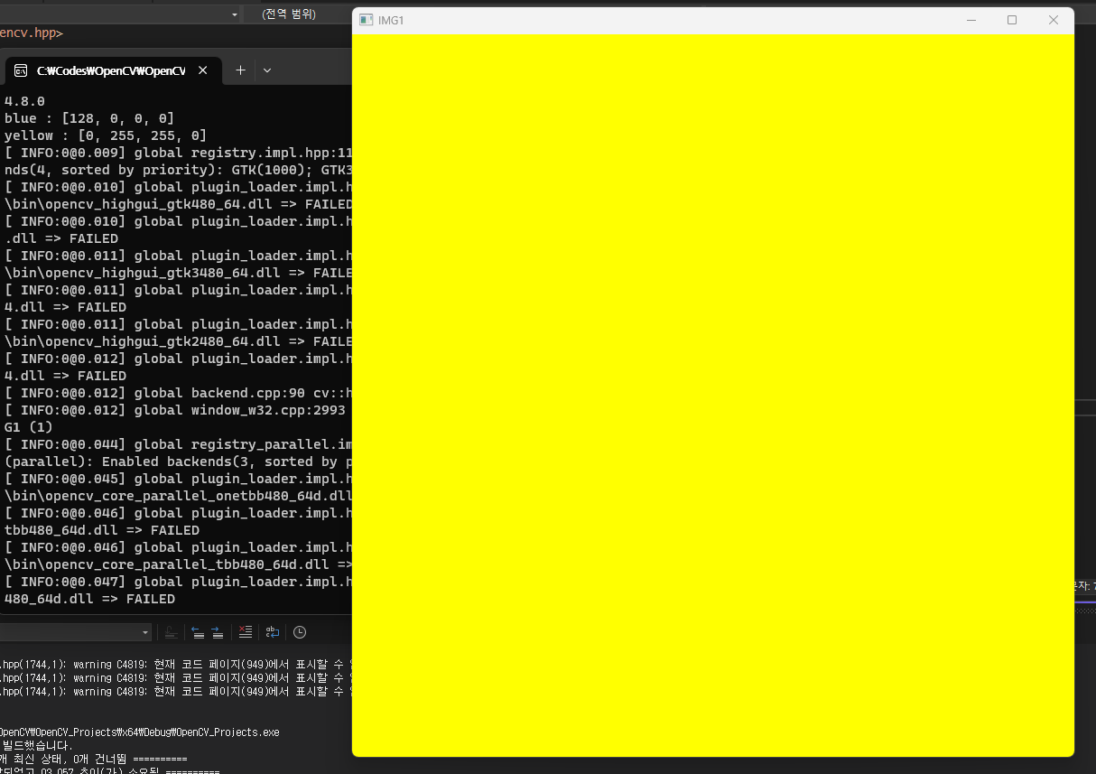 img1.setTo(cv::Scalar(0, 255, 255)); // img1을 노란색으로 바꿈