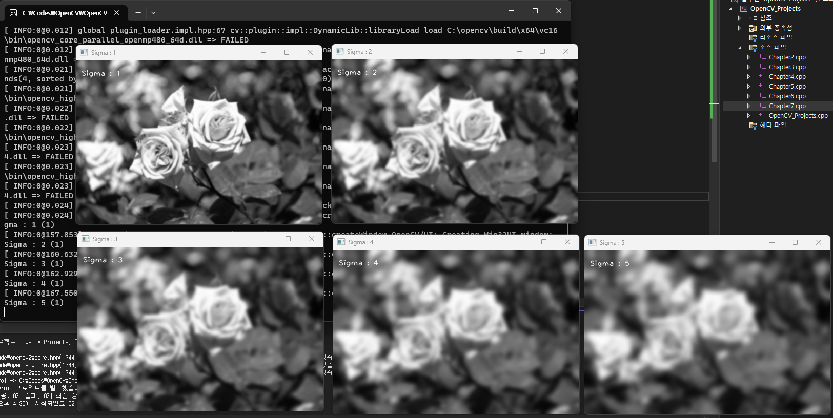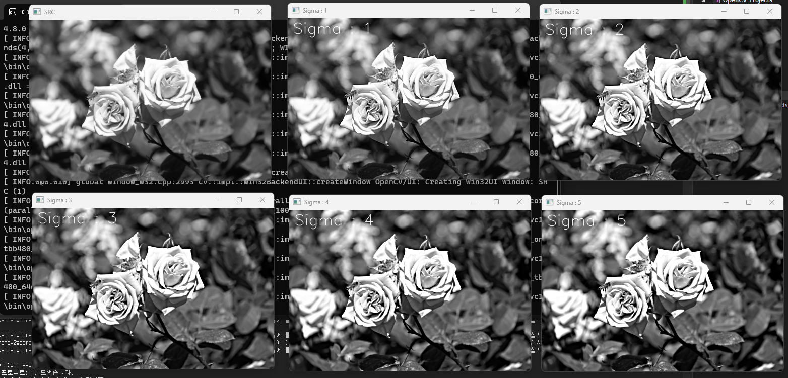 GaussianBlur(src, dst1, Size(), 5); //gaussian blur를 사용하면 주로엣지부분이 필터링된다. (sigma5)