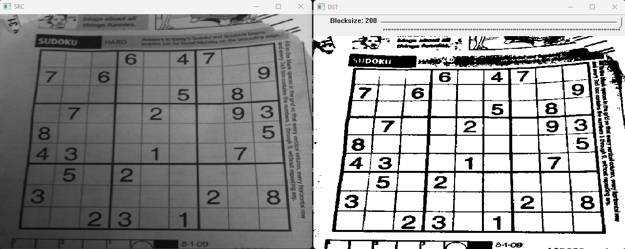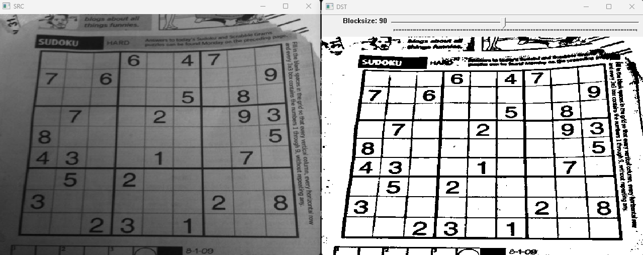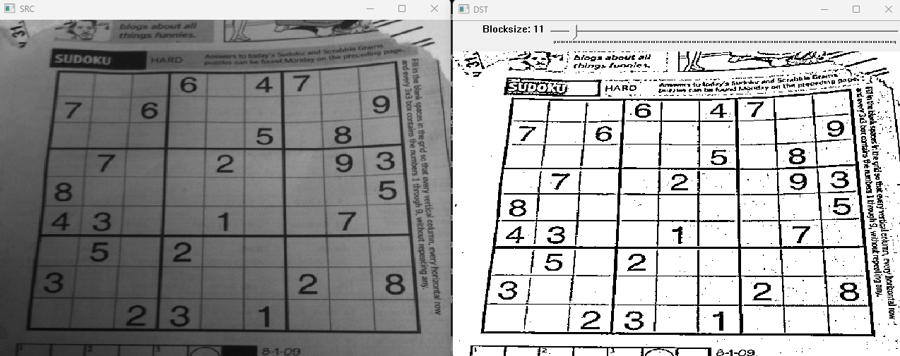 cv::adaptiveThreshold(src, dst, 255, cv::ADAPTIVE_THRESH_GAUSSIAN_C, cv::THRESH_BINARY, block_size, 5.0); // C 보통 5를 씀