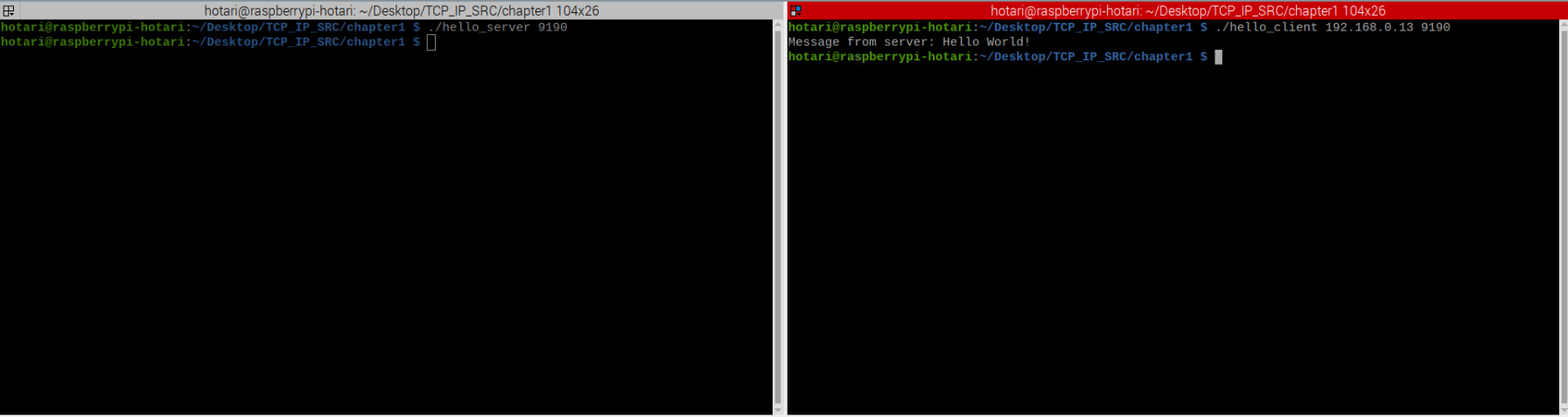 다른 터미널 창에 "./hello_client + IP주소 + 포트번호" 명령어를 입력하여 서버에 접속하면 코드에 작성되어있는 메세지가 나오게 된다.