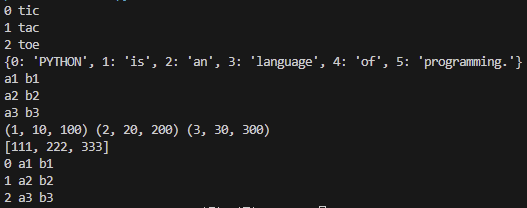 for i, v in enumerate(['tic', 'tac', 'toe']): # 리스트에 있는 인덱스와 값을 언패킹