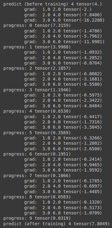 print("predict (after training)", 4, forward(4).data[0])