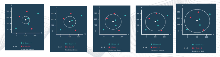 • 분류를 알 수 없는 데이터에 대해 가장 가까운 이웃 k개의 분류를 확인하여 다수결을 할 수 있다.