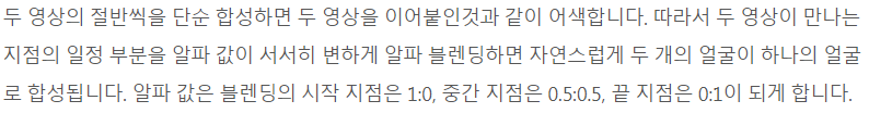 - alpha값을 각 영상에 가중치로 적용해 적절한 비중으로 배분