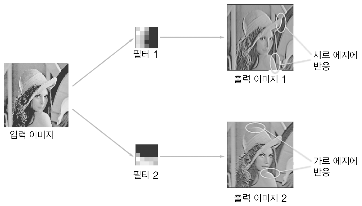 가로 에지와 세로 에지에 반응하는 필터 : 출력 이미지 1은 세로 에지에 흰 픽셀이 나타나고,출력 이미지 2 는 가로 에지에 흰 픽셀이 많이 나온다.
