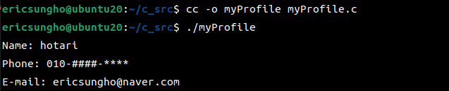 printf("Name: hotari\nPhone: 010-####-****\nE-mail: ericsungho@naver.com\n");