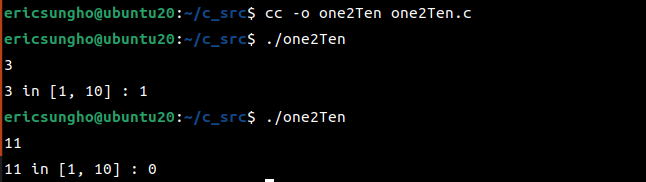 printf("%d in [1, 10] : %d\n", num, result);