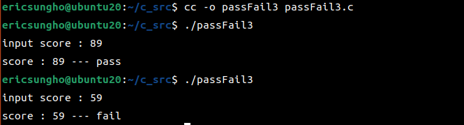 printf("score : %d --- %s\n", score, (score >= 60) ? "pass" : "fail");