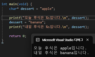 printf("오늘 후식은 %s입니다.\n", dessert);