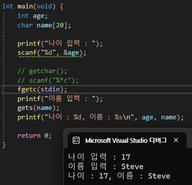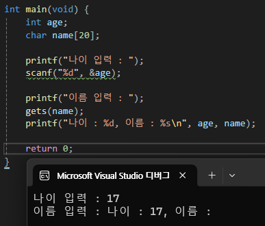 printf("나이 : %d, 이름 : %s\n", age, name);