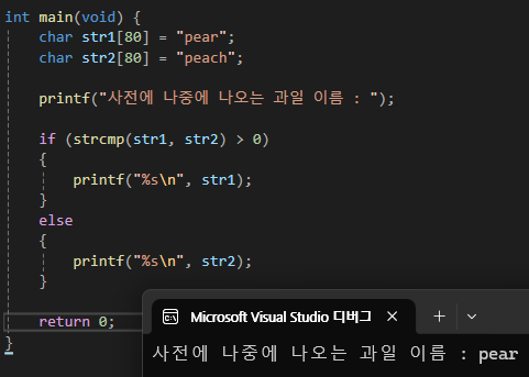 printf("사전에 나중에 나오는 과일 이름 : ");