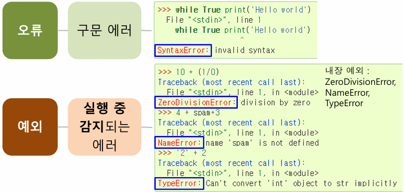 - 구문 에러가 없이 잘 작성된 코드라도 실행 도중에 에러가 발생할 수 있는데 이러한 잠재적인 에러를 '예외'라고 함