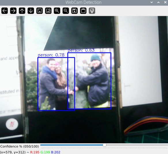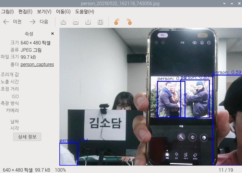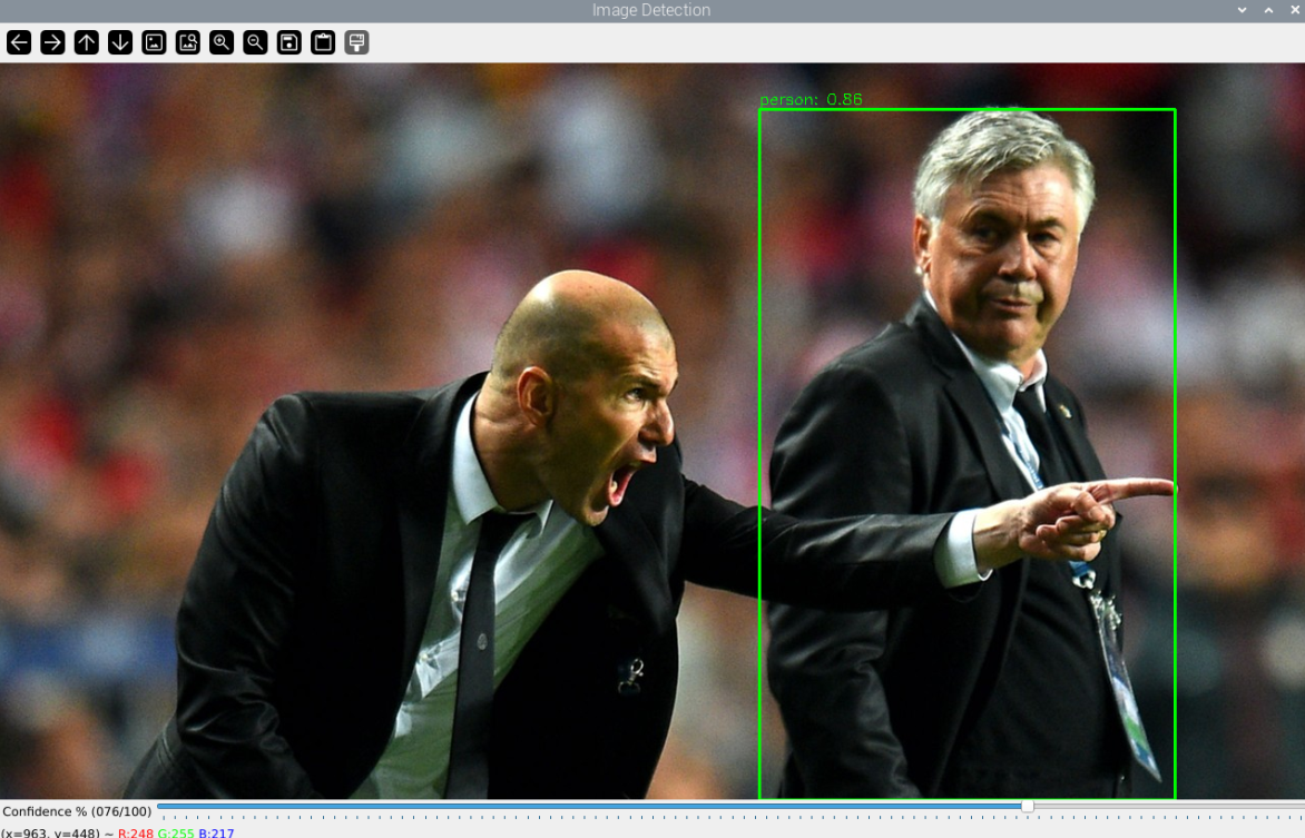 1. 라즈베리파이의 Pictures 디렉토리에 있는 이미지 파일을 선택하여 YOLO 모델 탐지를 수행하고 그 결과 이미지를 화면에 출력하시오. 출력 화면에는 TrackBar 를 설치하여 Slide를 조정함에 따라 Confidence 값이 미달하는 객체는 탐지결과에서 제외되도록 구성하시오.