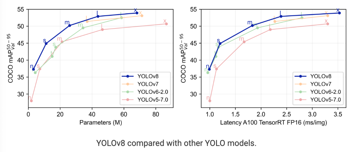 - 당장 YOLOv8 모델은 이전 YOLO 모델에 비해 훨씬 더 나은 성능을 보이는 것 같습니다. YOLOv5 모델뿐만 아니라 YOLOv8 모델도 YOLOv7 및 YOLOv6 모델에 비해 앞서고 있습니다.