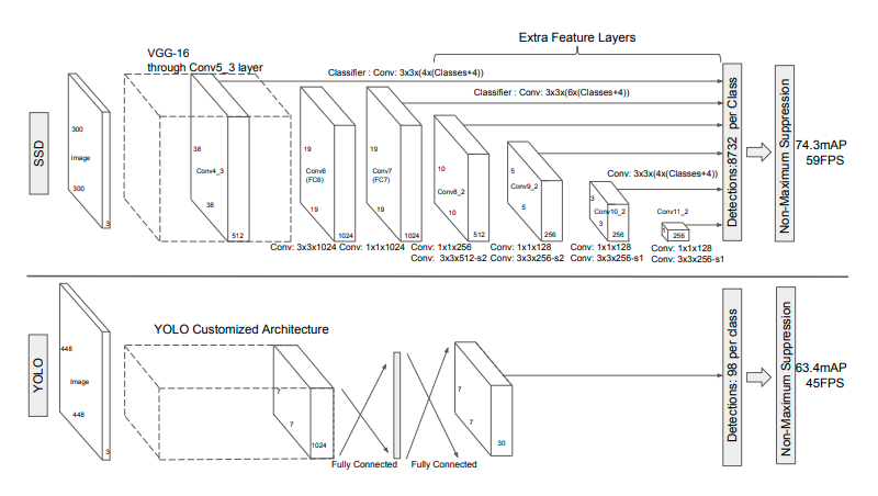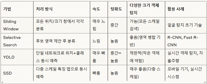 = > 특징: 다양한 스케일의 특징 맵을 사용하므로 다양한 크기의 객체를 효과적으로 탐지할 수 있으며, YOLO와 마찬가지로 단일 네트워크로 실시간 처리가 가능합니다.