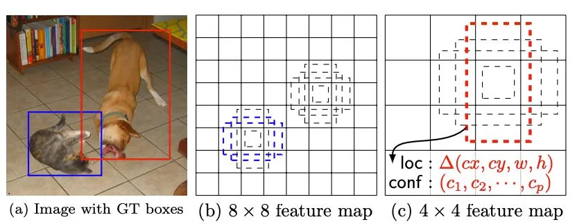 - 각 특징 맵의 각 위치마다 여러 개의 기본 박스 설정